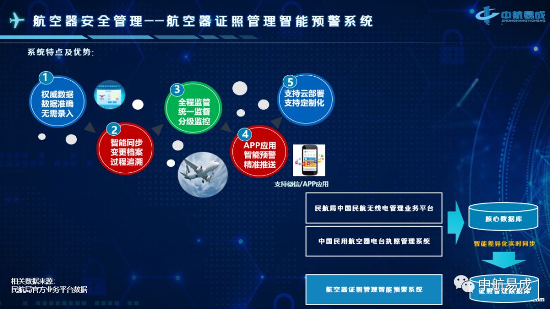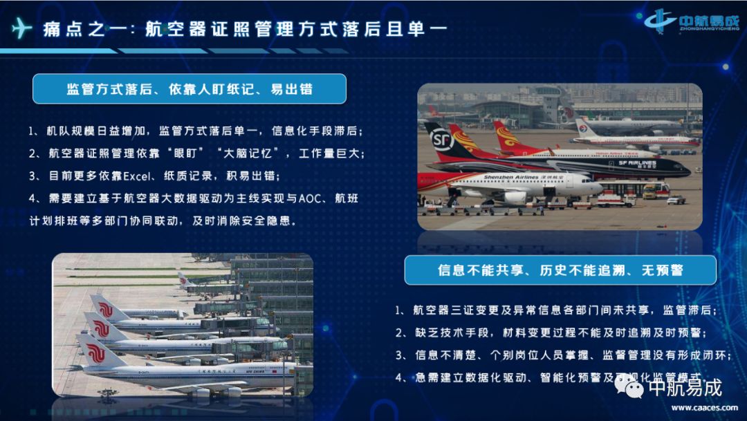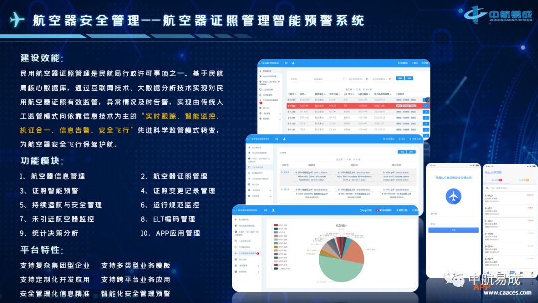 民用航空器证照管理是民航局行政许可事项之一。基于民航局业务平台,通过互联网技术、大数据分析技术实现对民用航空器证照有效监管,异常情况及时告警,实现由传统人工监管模式向依靠信息技术为主的“实时跟踪、智能监控、机证合一、信息告警、安全飞行”先进科学监管模式转变,为航空器安全飞行保驾护航。 已为国航总部、国航内蒙公司、国航大连航等约460余架航空器提供产品服务;已为南航总部、重庆航空、汕头航空、贵州航空、珠海航空、河南航空等约800余架航空器提供了产品服务。